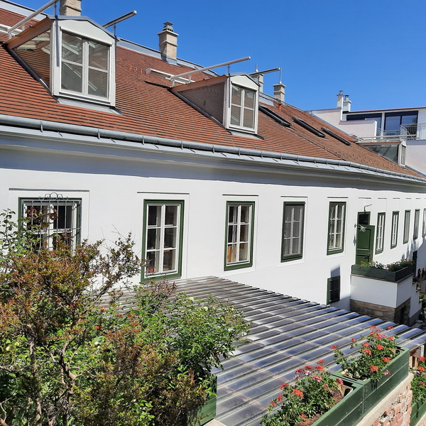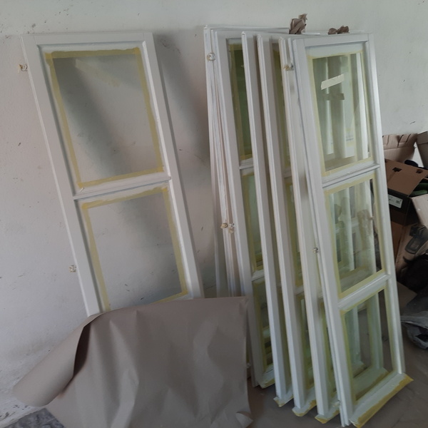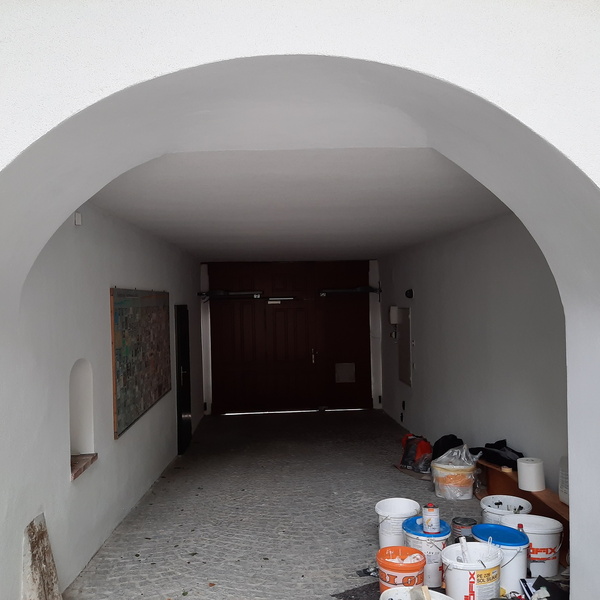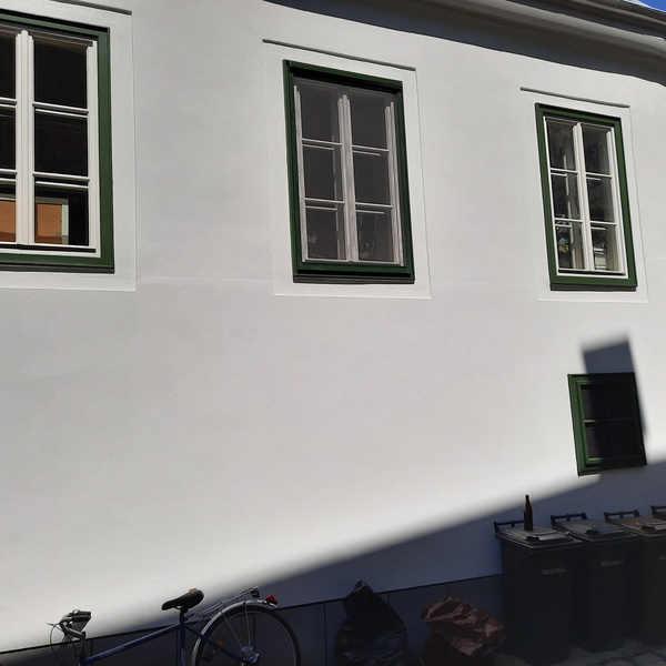 Die Fenster eingestellt, und gestrichen, Wintergarten vom Holz saniert, die Türen und straßenseitigen Fenster haben wir ebenfalls eingestellt und gestrichen. Unser Malerpartner durfte noch die Hausfassade und den Durchgang verschönern, sowie den Hof mit den historischen Steinplatten säubern.