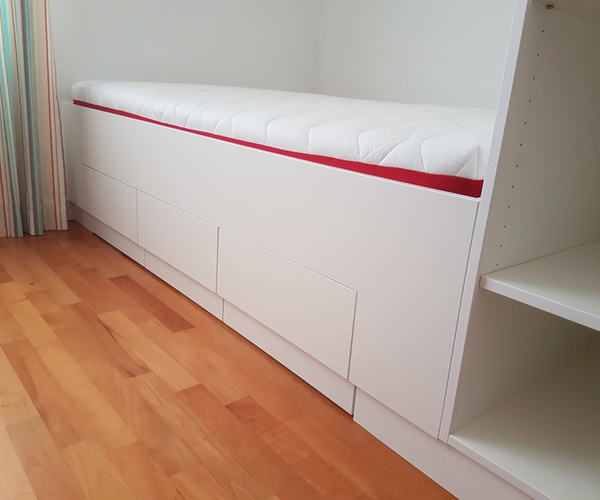 Das Ziel der neuen Einrichtung war ein mitwachsendes Kinder- und Jugendzimmer zu bekommen, das viel Stauraum bietet und von Beginn an gemütlich ist. Die Spiel- und Schulsachen sollten gut verstaut werden können und es musste genug Platz im Raum bleiben, damit auch ausreichend Spielfläche verbleibt.