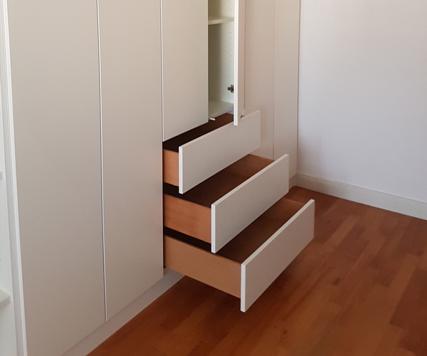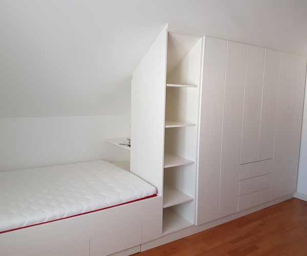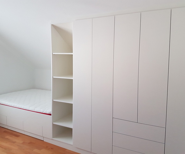 Es waren 2 Kinderzimmer, die im gleichen Haus innerhalb von 2 Jahren zu bauen waren. Im Stil einfach und schnörkellos, fast zurückhaltend gewünscht, von der Ausführung in mattem Weiß, Griffoptik wie Schleiflack ausgeführt.